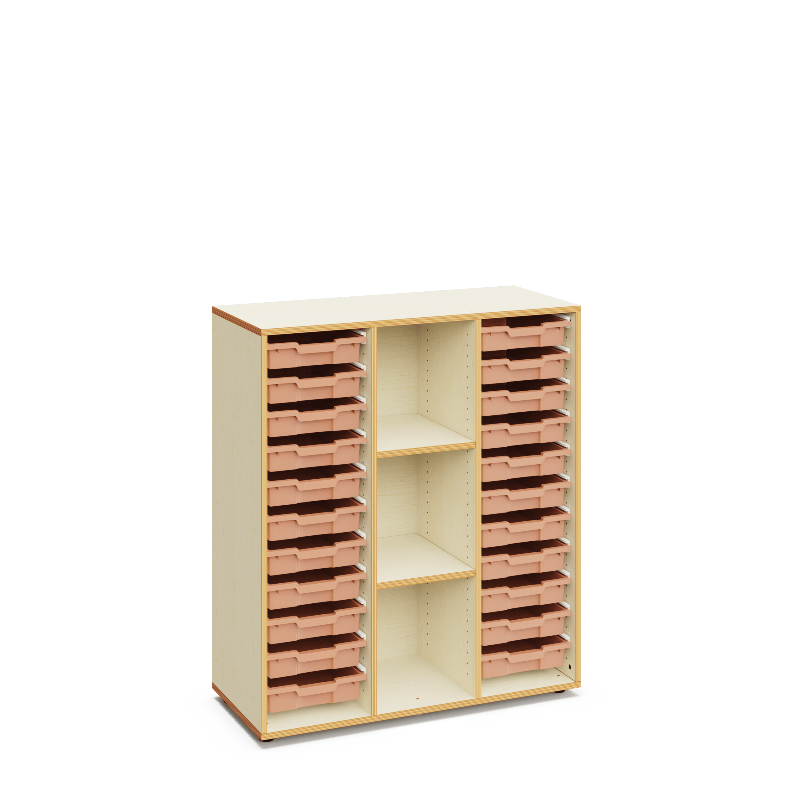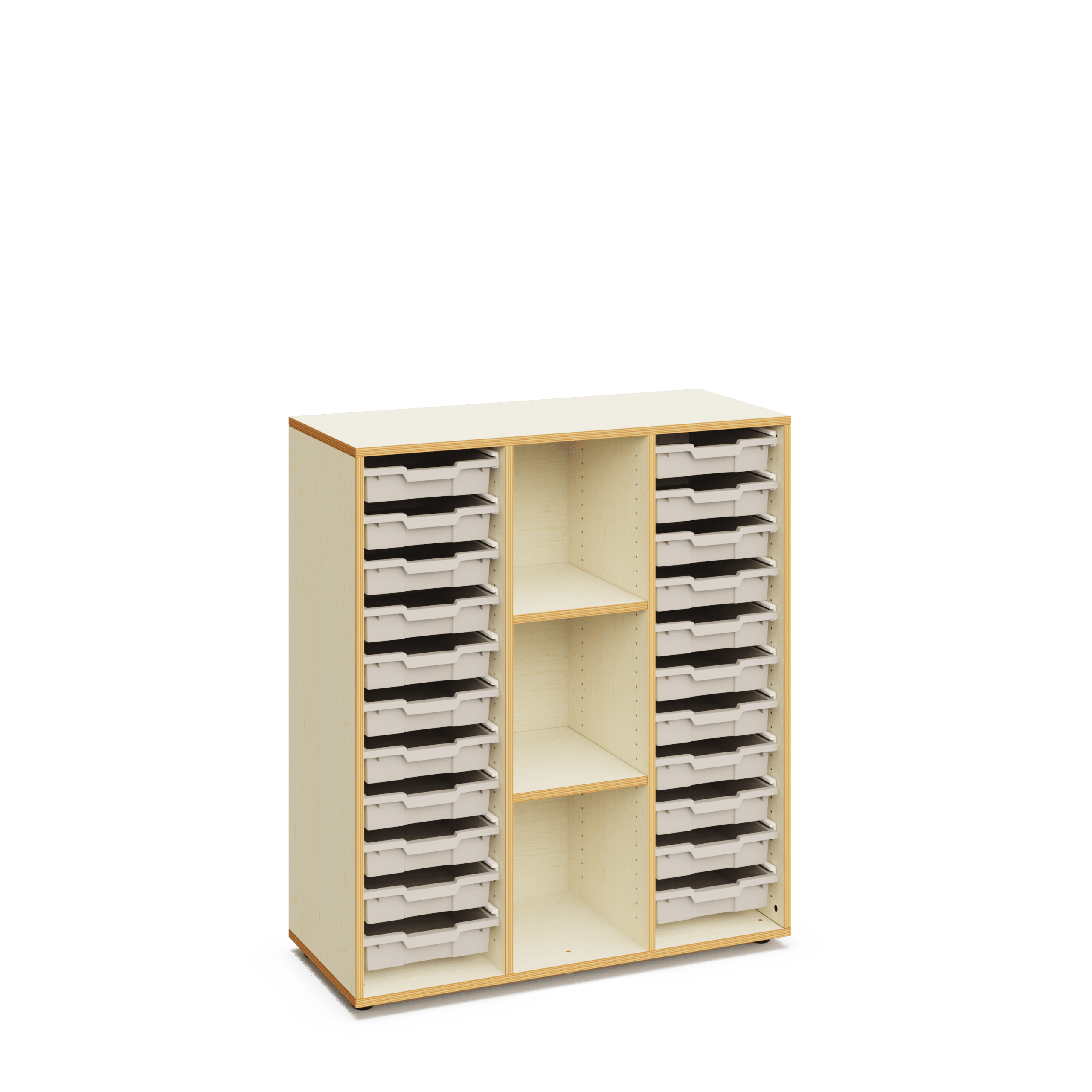 Schulschrank aus Holz mit einer Höhe von 120 cm, ausgestattet mit zwei Bereichen mit flachen Aufbewahrungsboxen sowie einem Bereich mit Regalböden. Ideal zur Ausstattung von Klassenräumen für kooperatives Lernen.