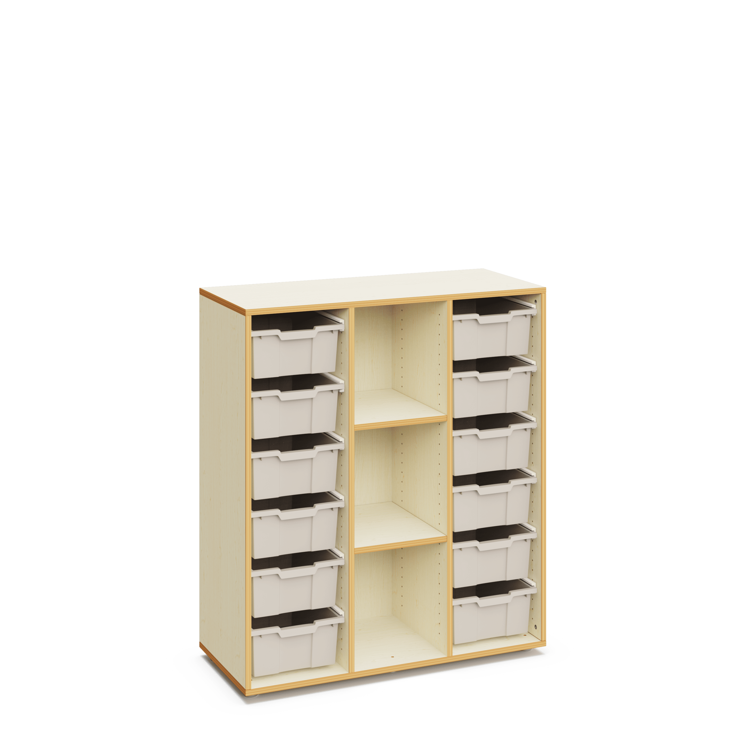 Schulschrank aus Holz mit einer Höhe von 120 cm, ausgestattet mit zwei Bereichen mit großen Aufbewahrungsboxen sowie einem Bereich mit Regalböden. Ideal zur Ausstattung von Klassenräumen für kooperatives Lernen.