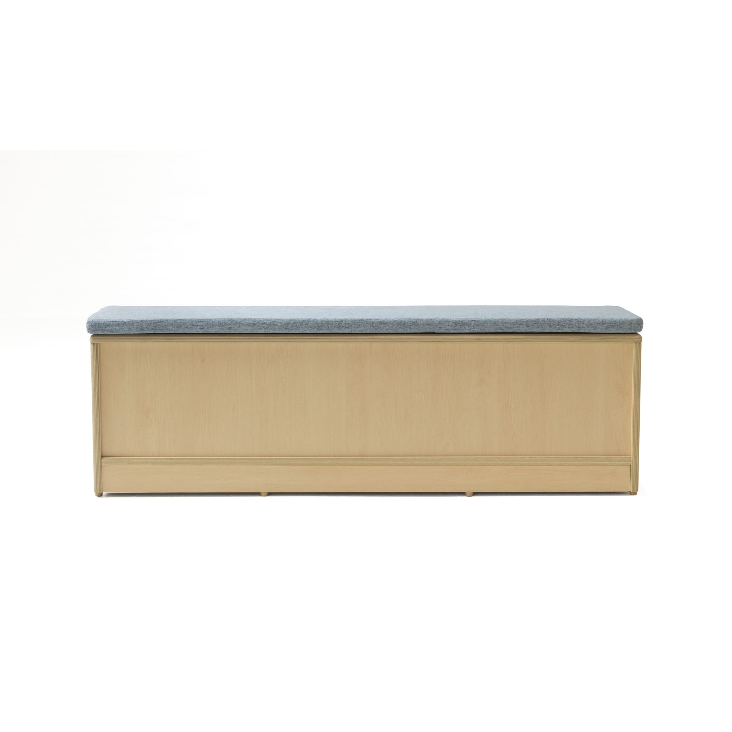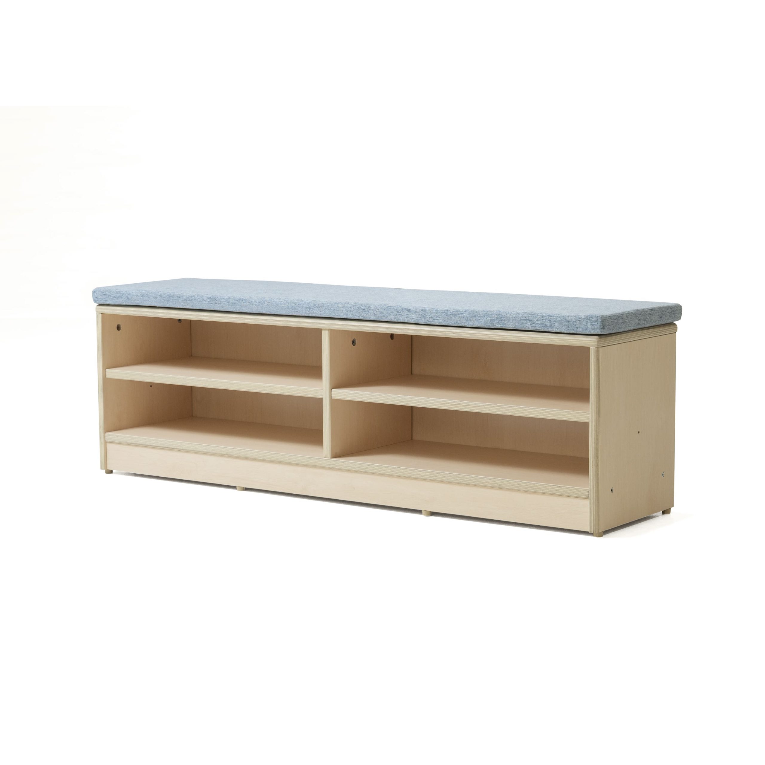 Kinderbank mit Aufbewahrungsregalen, gefertigt aus Birken-Sperrholz. Sie verfügt über vier offene Fächer, die den Zugang und die Organisation erleichtern. Das Design ist ideal für Klassenzimmer und Bildungsräume in Kindergärten.